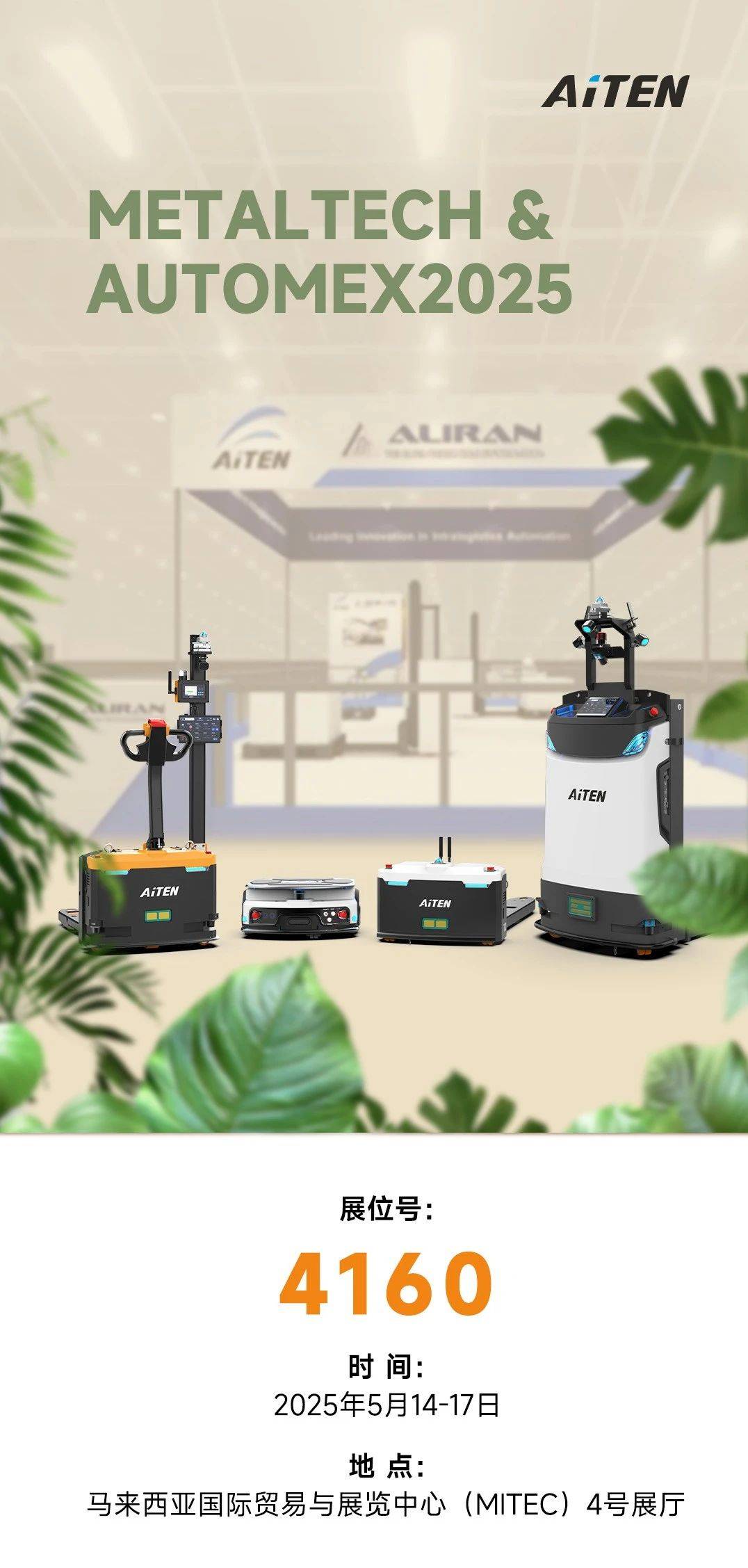 倒计时启动!诚邀您参与现场动态演示,开云KAIYUN体育AiTEN将携搬运移动机器人AM15,MP10,APE15,TT15惊艳亮相(2025.5.14-17)。